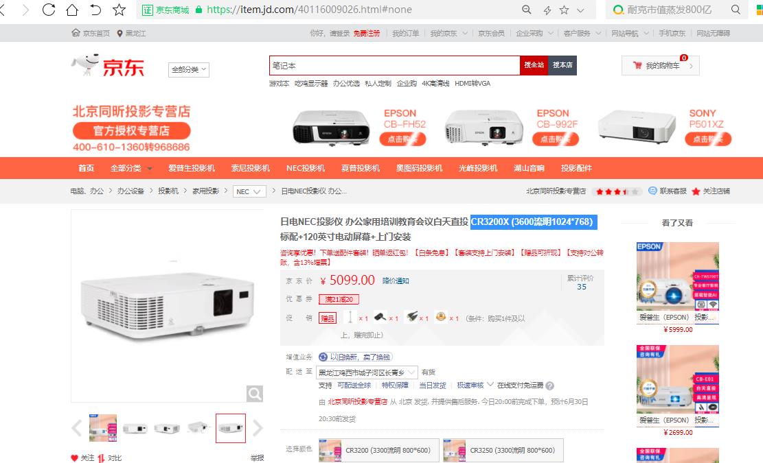 商品名称:日电NEC投影仪 办公家用培训教育会议白天直投 CR3200X (3600流明1024*768) 标配+120英寸电动屏幕+上门安装