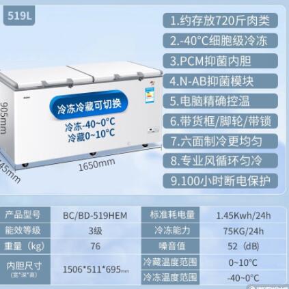 商品名称:海尔(Haier)家用冰柜商用卧式大容量冷藏冷冻转换零下40度超低温冷柜 顶开门断电保护速冻雪柜 519升 负40度 电子控温 519HEM